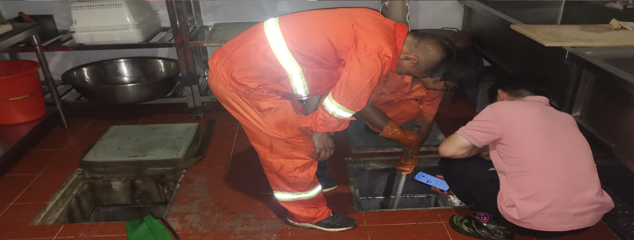 3. 多次冲洗,确保箱体内部清洁,连接横管经专业疏通压力弹簧管进行,深度疏通,确保横管畅通,无油污挂壁。